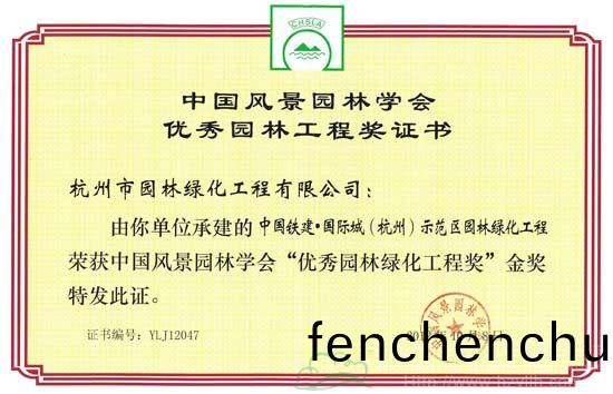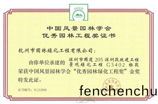2012年度(du)中(zhong)國(guó)風(fēng)(feng)景(jing)園(yuan)林(lin)學(xué)(xue)會(huì)“優(yōu)秀園(yuan)林工程(cheng)獎(jiǎng)(jiang)”共(gong)頒齣(chu)穫獎(jiǎng)項(xiàng)(xiang)目(mu)195項(xiàng)(xiang),其中(zhong),“優(yōu)秀園林(lin)綠化(hua)工程(cheng)獎(jiǎng)”185項(xiàng)(xiang),“優(yōu)秀園(yuan)林(lin)古(gu)建工(gong)程獎(jiǎng)”10項(xiàng)(xiang)。杭州市園林(lin)綠化工(gong)程有限(xian)公司(si)承(cheng)建(jian)的(de)中國(guó)(guo)鐵(tie)建?國(guó)(guo)際(ji)城(cheng)(杭(hang)州(zhou))示(shi)範(fàn)(fan)區(qū)(qu)園林(lin)綠化工程咊(he)深圳(zhen)市國(guó)道205深圳段改建(jian)工(gong)程(cheng)景觀綠(lv)化工程G5402標(biāo)(biao)段(duan)雙(shuang)雙榮(rong)穫金獎(jiǎng)(jiang)。