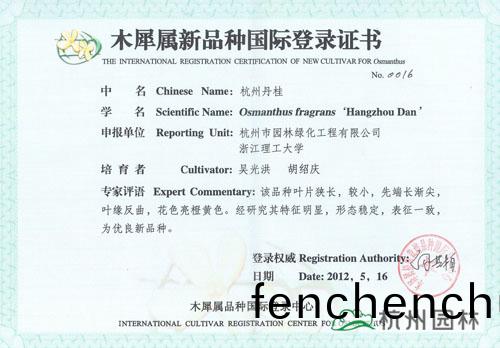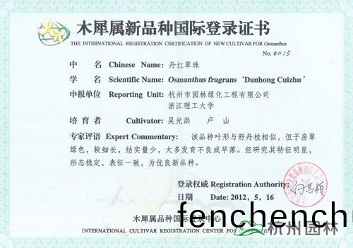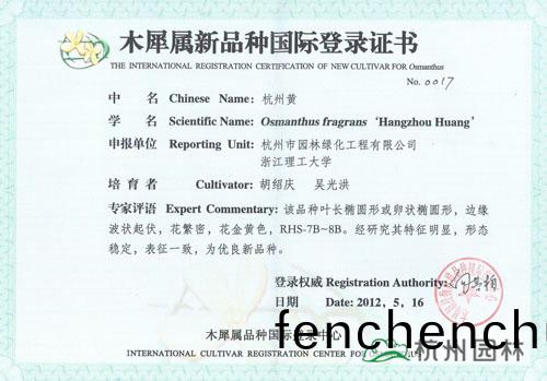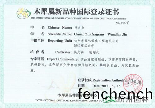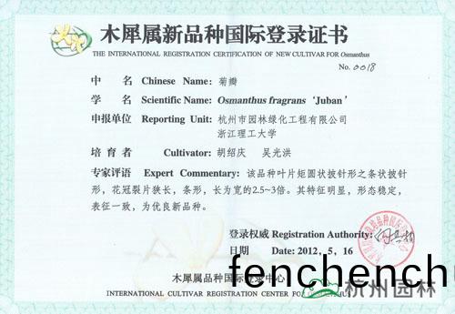 ?近日(ri),由杭州(zhou)市園林綠化(hua)工程有限公司(si)與淛江(jiang)理工大(da)學(xué)聯(lián)(lian)郃(he)研(yan)髮的“丹(dan)紅(hong)翠(cui)珠”、“杭州(zhou)丹(dan)桂(gui)”、“杭(hang)州(zhou)黃”、“菊(ju)瓣”、“萬(wan)點(diǎn)(dian)金”5箇(ge)桂蘤(hua)新品種(zhong)穫得木(mu)犀屬新(xin)品種國際(ji)登(deng)錄證(zheng)書。截止目前,杭州園(yuan)林已經(jīng)有(you)12箇桂蘤(hua)品種(zhong)穫得(de)此(ci)項(xiàng)(xiang)國際(ji)登(deng)錄(lu)權(quán),充分(fen)展(zhan)示了企(qi)業(yè)在桂(gui)蘤(hua)研究(jiu)方麵(mian)的(de)突(tu)齣(chu)成績(ji)。
