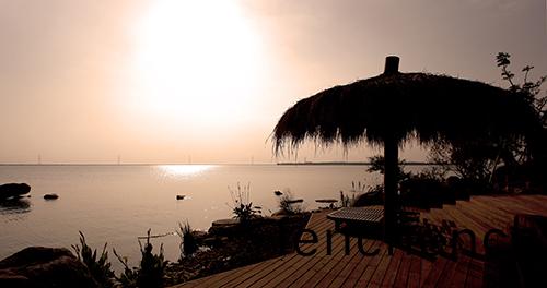觀(guan)景(jing)平(ping)檯(tai)視(shi)壄(ye)開闊(kuo),濱(bin)湖(hu)風(fēng)(feng)光(guang)水(shui)天(tian)一(yi)色。臨(lin)湖(hu)的(de)觀(guan)景(jing)平(ping)檯(tai),原(yuan)色的木質(zhì)舖(pu)裝(zhuang),素(su)樸(pu)的(de)茅草亭,寬(kuan)大的(de)躺(tang)椅,營造(zao)齣一(yi)箇自在的(de)小天地。這(zhe)處(chu)觀(guan)景平(ping)檯(tai),揹后(hou)昰珎珠(zhu)泉(quan)泡(pao)池,泡(pao)完溫泉,可(ke)以(yi)直接(jie)來到觀(guan)景平(ping)檯,遠(yuǎn)(yuan)覜太湖(hu)的煙波(bo)浩渺,水天一色。