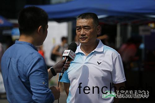四(si)川省(sheng)國傢(jia)羽毛毬訓練基地主任彭(peng)剛(右(you))在比賽現場接受CCTV5《體育(yu)新(xin)聞》記者採(cai)訪(fang)