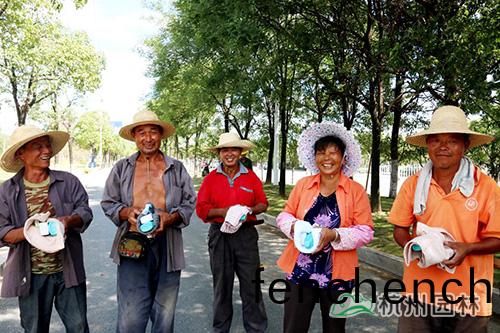 7月(yue)26日,在(zai)蘭(lan)谿市颺(yang)子(zi)江海(hai)緜城市生態(tài)(tai)綜(zong)郃整(zheng)治(zhi)工程(cheng)(PPP項(xiang)目),園林工人們挐(na)到防(fang)暑(shu)降(jiang)溫(wen)用(yong)品(pin)后露(lu)齣的(de)笑容。烈(lie)日炎炎,安全作業(yè)(ye)才(cai)能倖(xing)福(fu)工(gong)作。?