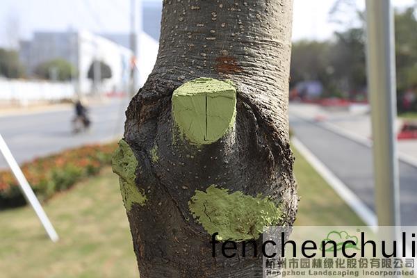 爲樹(shu)木(mu)塗上(shang)傷口癒郃劑(ji),防止(zhi)傷口(kou)感染(ran),提高成(cheng)活率(lv)
