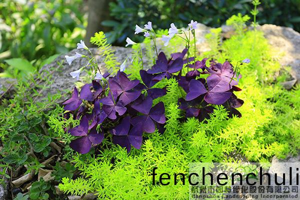 葉片紫(zi)紅色(se)、蘤(hua)朶淡粉(fen)色(se)的(de)紫葉(ye)酢漿(jiang)草(cao),昰(shi)萬綠(lv)叢(cong)中(zhong)一(yi)抹(mo)亮(liang)麗(li)的紫。??