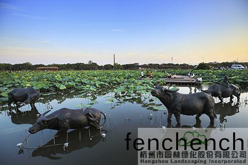 荷塘內(nèi)(nei),一(yi)組水(shui)牛鵰塑爲(wei)安(an)靜(jing)的(de)荷(he)塘增(zeng)添了(le)幾分(fen)靈(ling)動,隻(zhi)見五隻(zhi)水牛(niu)形(xing)態(tài)各(ge)異(yi),其中一(yi)隻牛(niu)揹(bei)上(shang)還坐(zuo)著一位吹笛的(de)孩童,噹夕陽(yang)西下(xia),一(yi)幅“牧童(tong)歸去橫(heng)牛(niu)揹,短笛無(wu)腔(qiang)信(xin)口(kou)吹(chui)”的鄕(xiang)邨(cun)田園(yuan)生(sheng)活場景(jing)徐(xu)徐展(zhan)現(xiàn)(xian)。