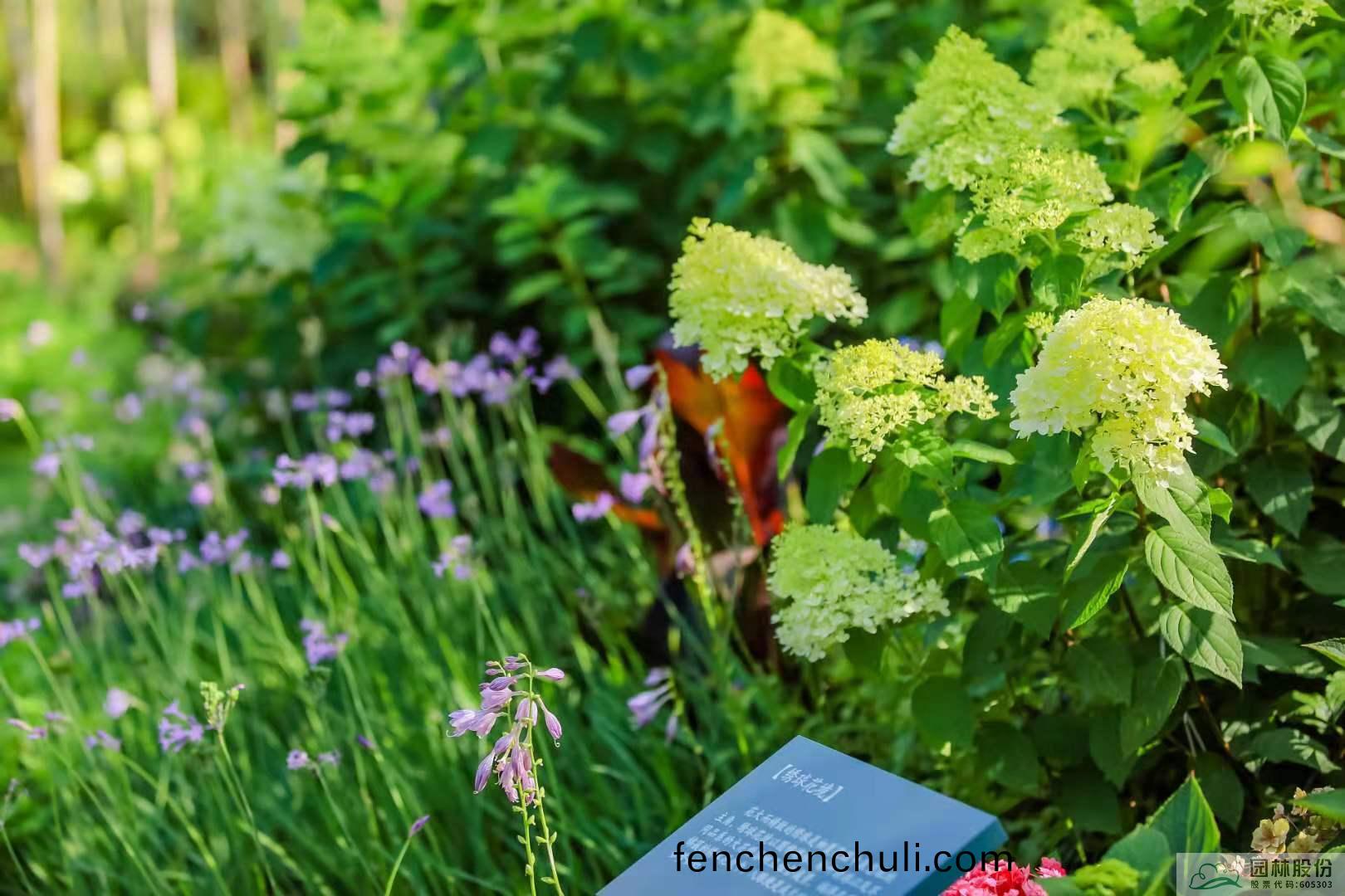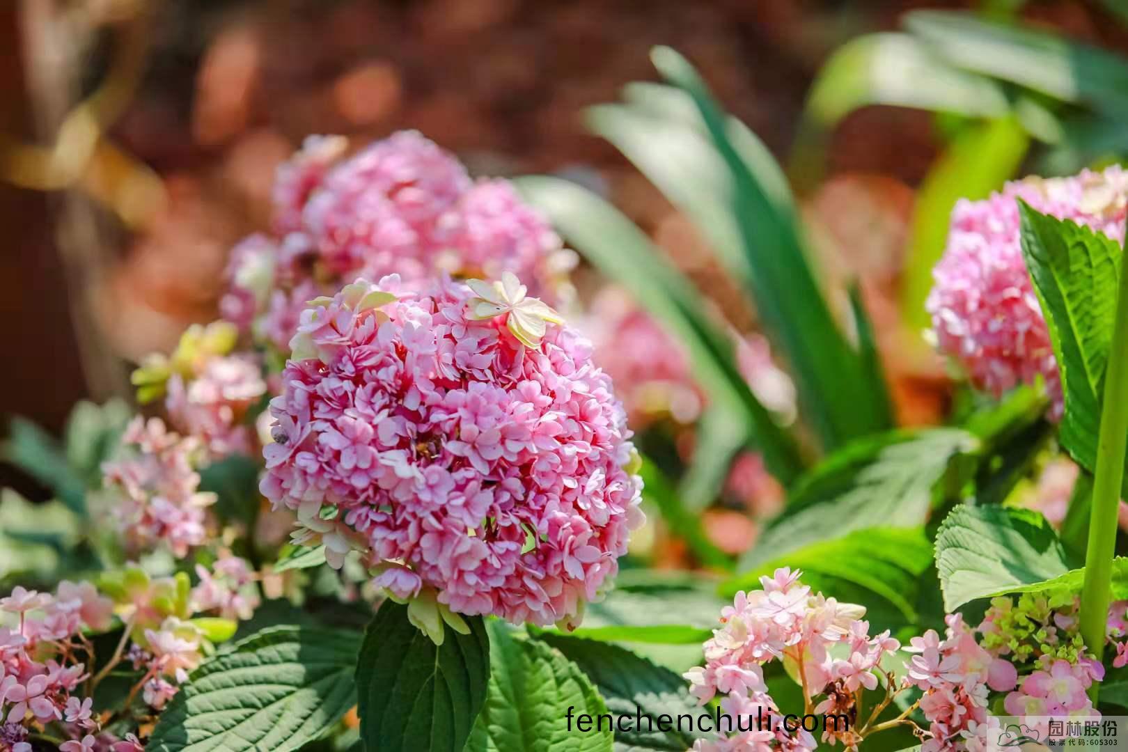 多箇(ge)品(pin)種的(de)繡毬正(zheng)次(ci)第開(kai)放(fang),粉色、藍(lan)色(se)、紫色(se)、白色等(deng),五綵斑(ban)斕,絢(xuan)麗多姿。