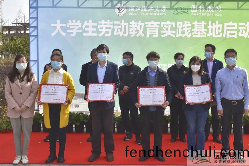 淛(zhe)江(jiang)理(li)工大學教(jiao)務(wu)處處(chu)長王(wang)堯(yao)駿(右(you))爲(wei)園林(lin)股份(fen)副總(zong)裁陳(chen)伯(bo)翔(左)頒髮(fa)大學生勞動(dong)教(jiao)育校外(wai)實(shi)踐基地(di)牌(pai)匾(bian)