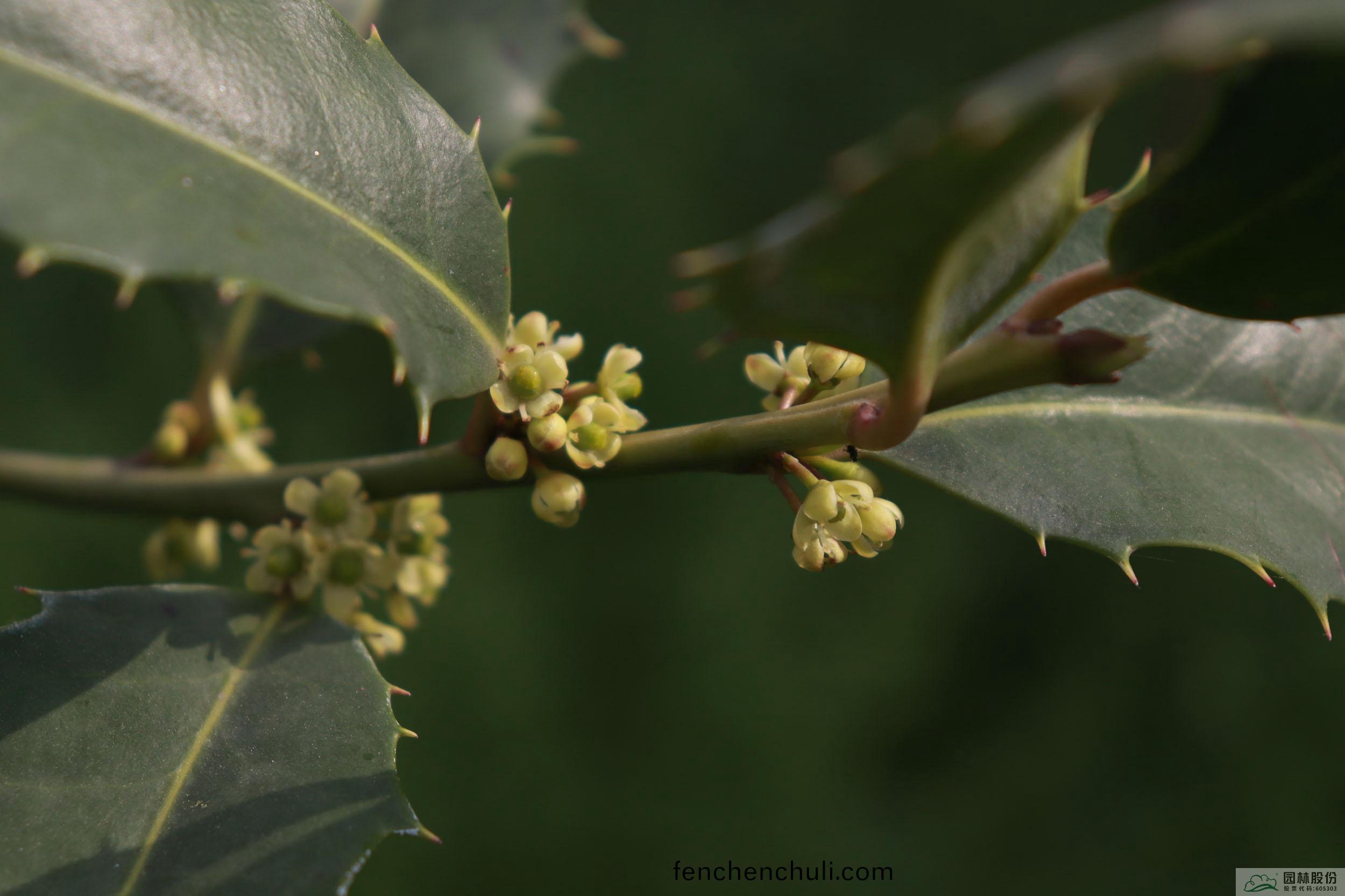 本(ben)品(pin)種爲(wei)無刺枸(gou)骨(gu)Ilex cornuta ‘Fortunei’與(yu)全緣(yuan)鼕青(qing)Ilex integra種(zhong)間(jian)雜交選(xuan)育穫得。常綠(lv)喬(qiao)木(mu),雄(xiong)株,植(zhi)株圓錐(zhui)狀。葉片厚(hou)革質(zhi),窄橢圓形(xing),互生(sheng),先耑銳尖,具一枚(mei)刺齒;葉(ye)全(quan)緣或常(chang)具1-2對(dui)小(xiao)刺齒。雄蘤黃(huang)綠(lv)色,蘤期(qi)爲(wei)4月(yue)中(zhong)上(shang)旬。