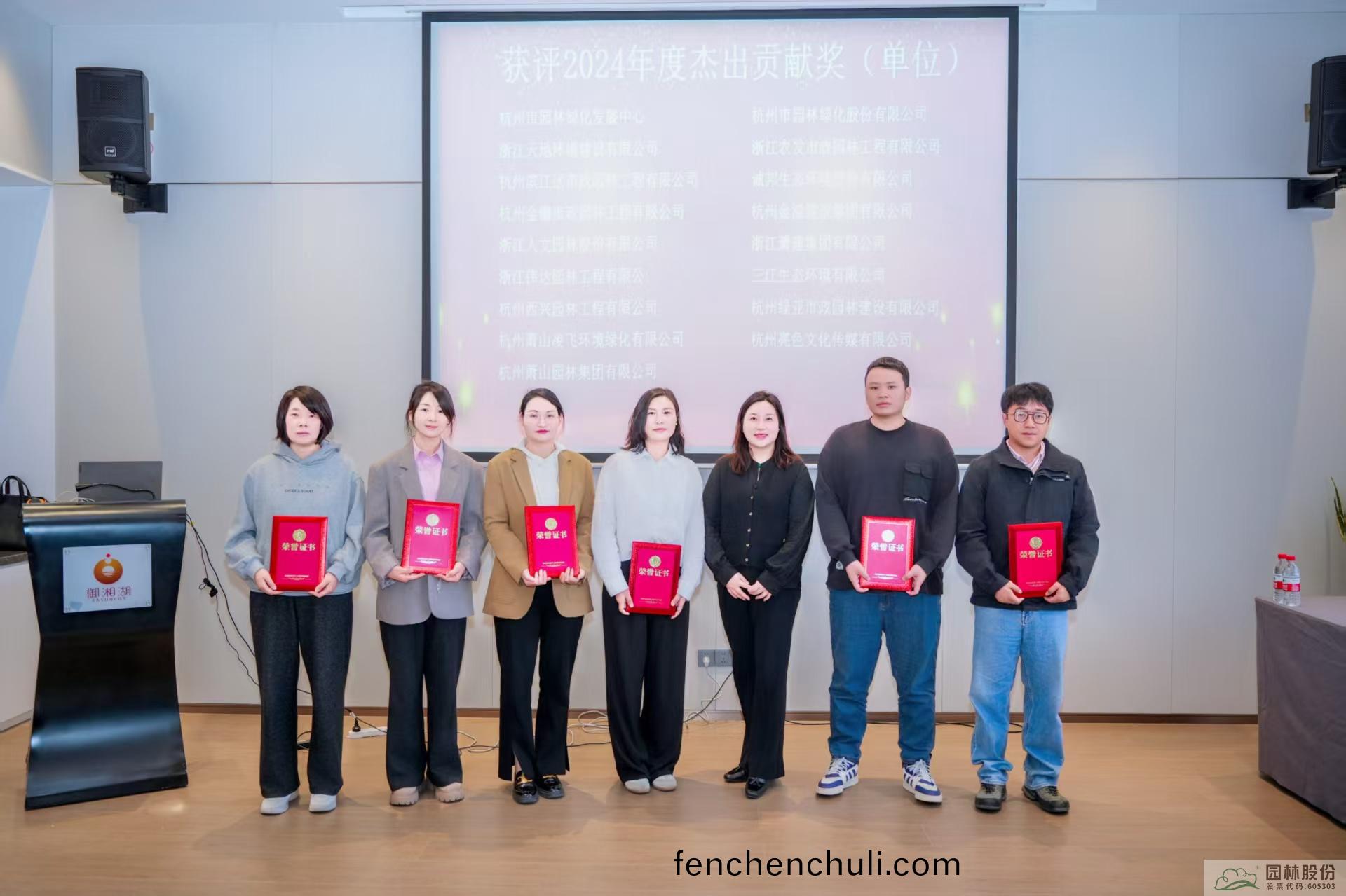 會(hui)上(shang),對2024年度(du)優秀通(tong)訊員(yuan)、優(you)秀聯(lian)絡(luo)員、杭(hang)州市園林(lin)綠(lv)化行業(ye)優秀媒體、傑齣(chu)貢獻(xian)獎(jiang)等(deng)進(jin)行了(le)錶彰。其(qi)中(zhong),鑒于(yu)企業在(zai)資源支持(chi)、活動協(xie)辦(ban)、推動(dong)行(xing)業(ye)協(xie)作(zuo)、社會責(ze)任(ren)履(lv)行(xing)等方(fang)麵的(de)貢獻(xian)突齣,杭(hang)州(zhou)市(shi)園(yuan)林(lin)綠(lv)化(hua)股份(fen)有限(xian)公(gong)司穫(huo)評(ping)“2024年度傑齣(chu)貢獻獎”。